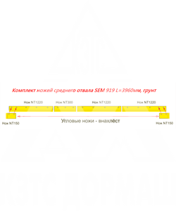 Ножи отвала для грейдеров SEM 919. Комплект состоит из 4-х твердосплавных ножей: NT1220 - 3 штуки и NT300 - 1штука. Установка на средний отвал L=3960мм. Ножи отвала марки NT - твердосплавные (вставка 9.3мм) для грунта. Для быстрого поиска можно воспользоваться сервисом "Подбор продукции по применяемости" - вкладка "Поиск" или обратиться к соответствующему разделу Каталога. По результатам работы в зимних условиях по содержанию и летом при строительстве, планировке наработка достигает 1000-1200 моточасов, что подтверждается письмами от «Ямалавтодор», «Северавтодор», "КОМИ дорожная компания" и представлены в разделе «Отзывы потребителей». Установка стандартных боковых ножей отвала - не требуется. В качестве дополнительного упрочнения и защиты отвала по бокам нами предлагается к использованию "боковая накладка" - короткий нож NT150, который вместе с основными ножами на SEM 919 образует рабочую зону в форме угла 90°, полностью армированную твердосплавными элементами.